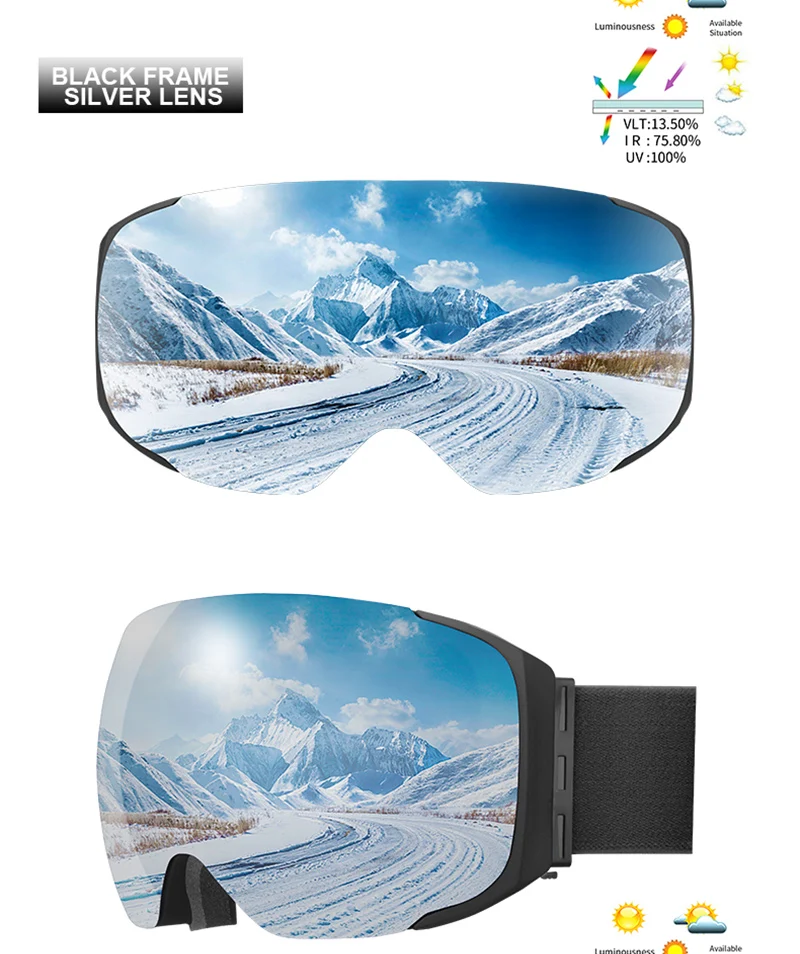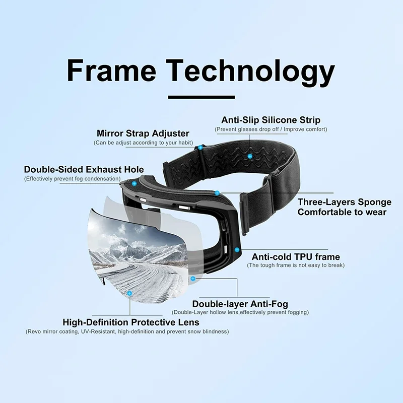 • Double Layer Anti-Fog Design :The double-layer anti-fog design ensures clear vision during skiing and snowboarding, even in wet conditions.